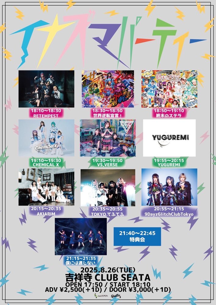 「イナズマパーティー」at 吉祥寺CLUB SEATA SCHEDULE 2025/08/26(火) 吉祥寺CLUB SEATA 地図を表示 「イナズマパーティー」at 吉祥寺CLUB SEATA OPEN 17:50 / START 18:10 ライブ▶︎19:55〜20:15 特典会▶︎21:40〜22:45 お目当て特典🎁サインありチェキ券+YUGUREMI ポイントカード1P チケット料金▶︎ adv¥2,500 / door¥3,000 +1D チケット予約サイト URLをコピーする 報告する