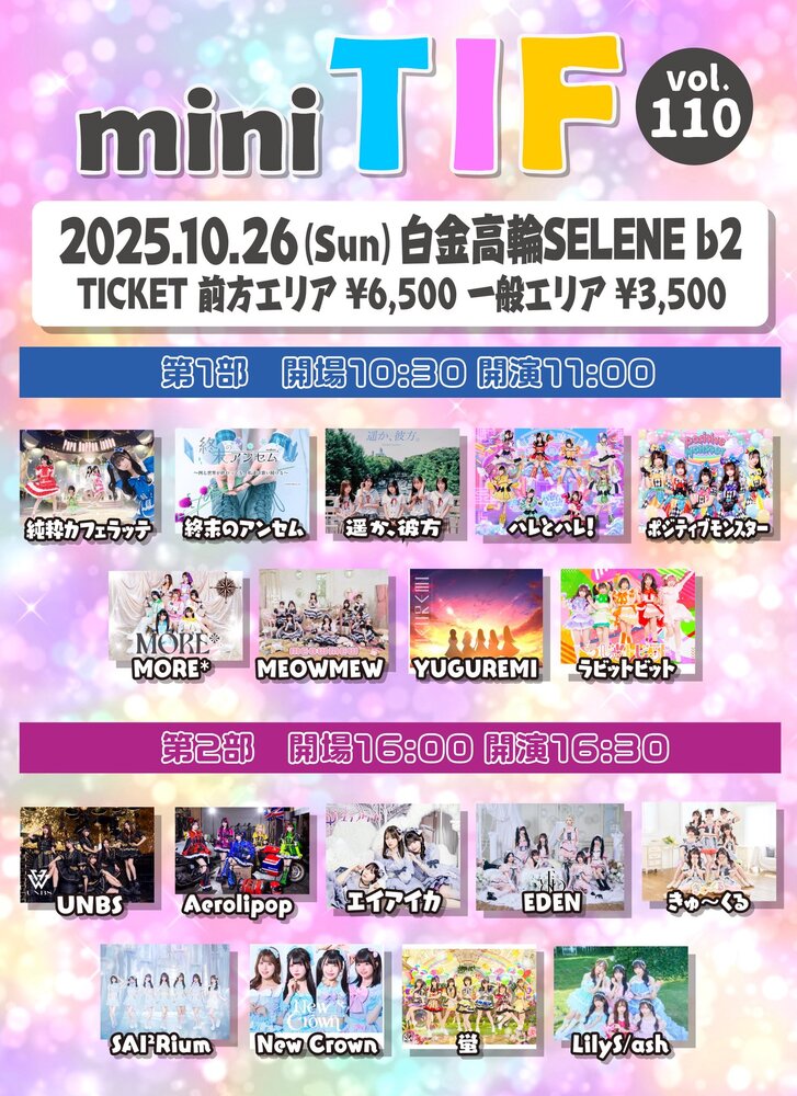 「mini TIF vol.110」at 白金高輪SELENE b2 SCHEDULE 2025/10/26(日) 白金高輪SELENE b2 地図を表示 「mini TIF vol.110」at 白金高輪SELENE b2 第1部 OPEN 10:30 / START 11:00 ライブ▶︎ 特典会▶︎ お目当て特典🎁 チケット料金▶︎前方エリア¥6,500 / 一般エリア¥3,500 +1D チケット予約サイト URLをコピーする 報告する
