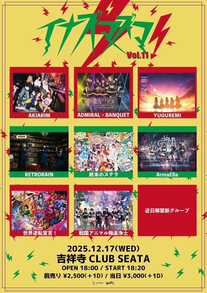 「イナズマズマvol.11」at 吉祥寺CLUB SEATA SCHEDULE 2025/12/17(水) 吉祥寺CLUB SEATA 地図を表示 「イナズマズマvol.11」at 吉祥寺CLUB SEATA OPEN 18:00 / START 18:20 ライブ▶︎特典会▶︎お目当て特典🎁 ▼チケット料金▼前売り¥2,500 / 当日¥3,000+1D チケット予約サイト URLをコピーする 報告する