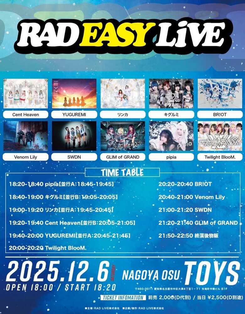 「RAD EASY LIVE」at 大須TOYS SCHEDULE 2025/12/06(土) 大須TOYS 地図を表示 「RAD EASY LIVE」at 大須TOYS OPEN 18:00 / START 18:20ライブ▶︎19:40〜20:00特典会▶︎20:45〜21:45お目当て特典🎁全員チェキ券 チケット料金▶︎前売券¥2,000 / 当日券¥2,500+1D チケット予約サイト URLをコピーする 報告する