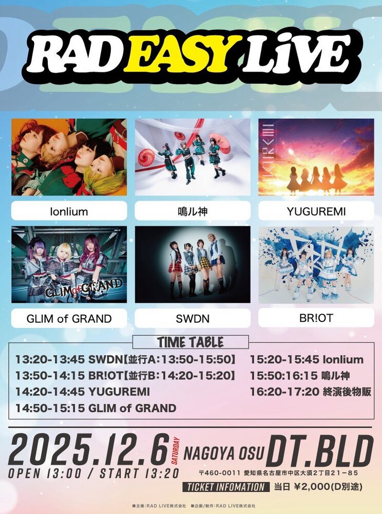 「RAD EASY LIVE」at Dt.BLD SCHEDULE 2025/12/06(土) Dt.BLD 地図を表示 「RAD EASY LIVE」at Dt.BLD OPEN 13:00 / START 13:20ライブ▶︎14:20〜14:45特典会▶︎16:20〜17:20お目当て特典🎁2025 LAST 遠征Pカード チケット料金▶︎当日券¥2,000+1D URLをコピーする 報告する