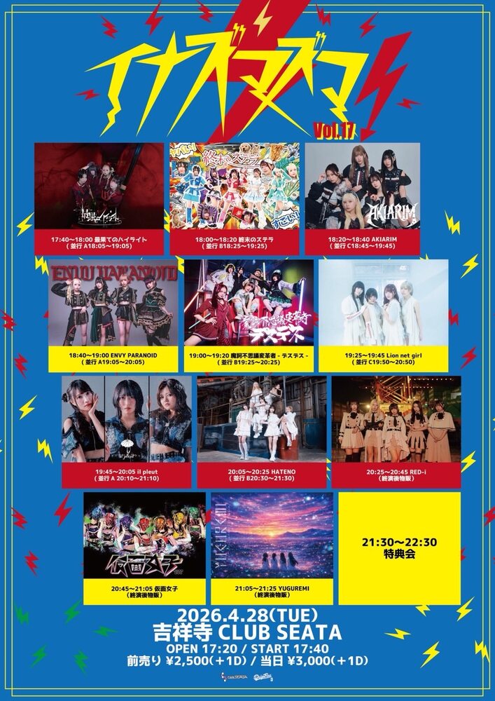 「イナズマズマvol.17」at 吉祥寺CLUBSEATA SCHEDULE 2026/04/28(火) 吉祥寺CLUB SEATA 地図を表示 ◼︎ 記録2026.04.28(火)吉祥寺CLUBSEATAOPEN 17:20 / START 17:40ライブ 21:05〜21:25特典会 21:30〜22:30 ◼︎ 観測方法前売り¥2,500 / 当日¥3,000※各券種+1D[YUGUREMI入場 サインありチェキ券+ポイントカード1P] チケット予約サイト URLをコピーする 報告する