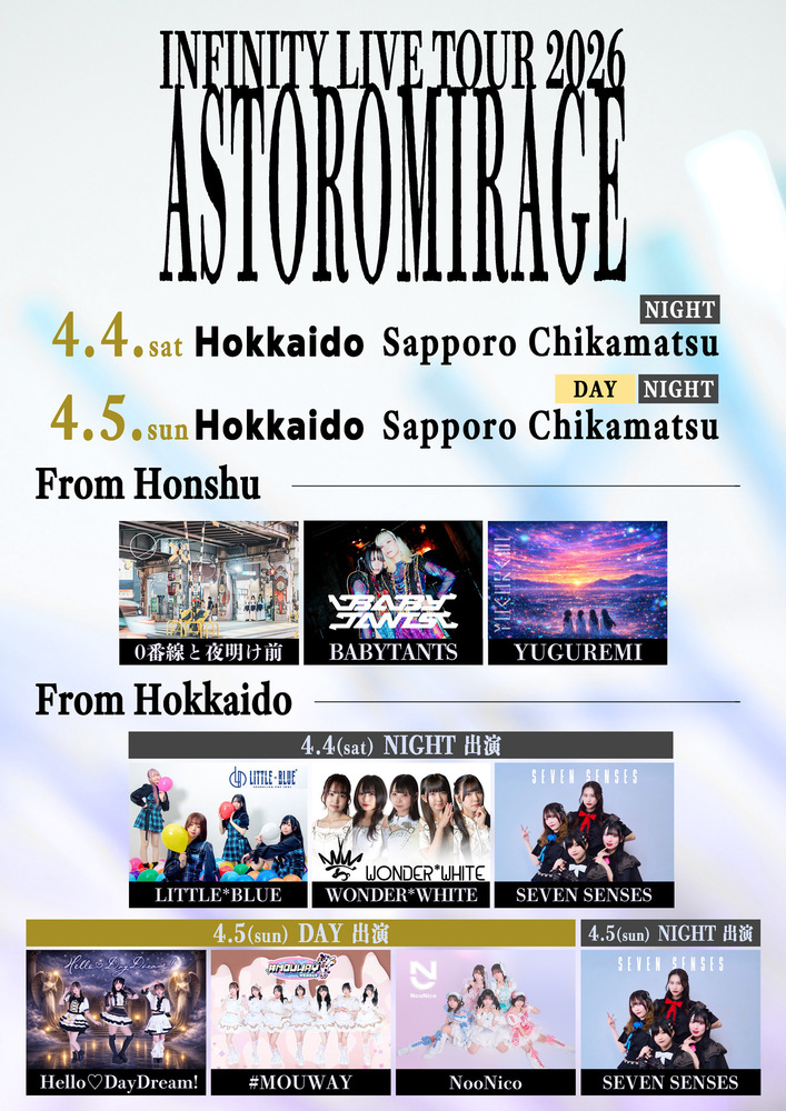 「INFINITY LIVE TOUR 2026 ASTOROMIRAGE」at 北海道・札幌近松 SCHEDULE 2026/04/04(土) - 2026/04/05(日) 「INFINITY LIVE TOUR 2026 ASTOROMIRAGE」at 北海道・札幌近松 ◼︎ 記録2026.04.04(土) / 04.05(日)北海道・札幌近松 ◼︎ 観測方法お待ちください。 ◼︎ 観測詳細お待ちください。 URLをコピーする 報告する