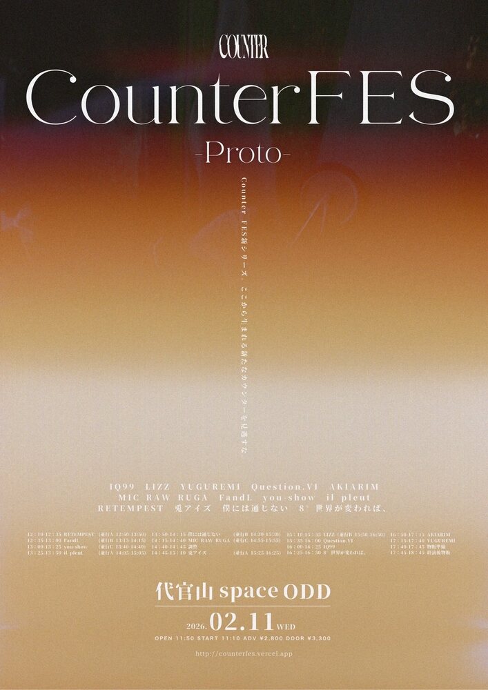 「Counter FES-Proto-」at 代官山SpaceODD SCHEDULE 2026/02/11(水) 代官山SpaceODD 地図を表示 「Counter FES-Proto-」at 代官山SpaceODD OPEN 11:50 / START 12:10 ライブ▶︎17:15〜17:40特典会▶︎17:45〜18:45お目当て特典🎁サインありチェキ+限定特典ポイントカード ▼チケット料金▼前売り ¥2,800 / 当日 ¥3,300+1D チケット予約サイト URLをコピーする 報告する