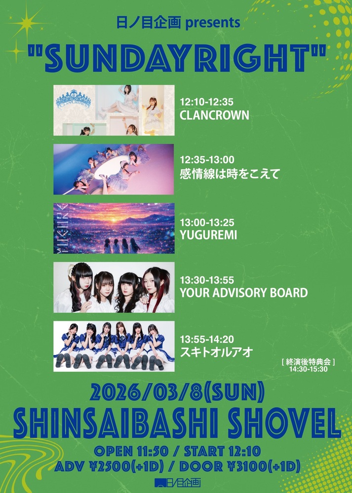 「日ノ目企画presents "SUNDAYRIGHT"」at 心斎橋SHOVEL SCHEDULE 2026/03/08(日) 心斎橋SHOVEL 地図を表示 ◼︎ 記録2026.03.08(日)DESEOminiOPEN 11:50 / START 12:10ライブ 13:00〜13:25特典会 14:30〜15:30 ◼︎ 観測方法ADV ¥2,500 / DOOR ¥3,100※各券種+1D[YUGUREMI入場 サインありチェキ券+ポイントカード5P] チケット予約サイト URLをコピーする 報告する